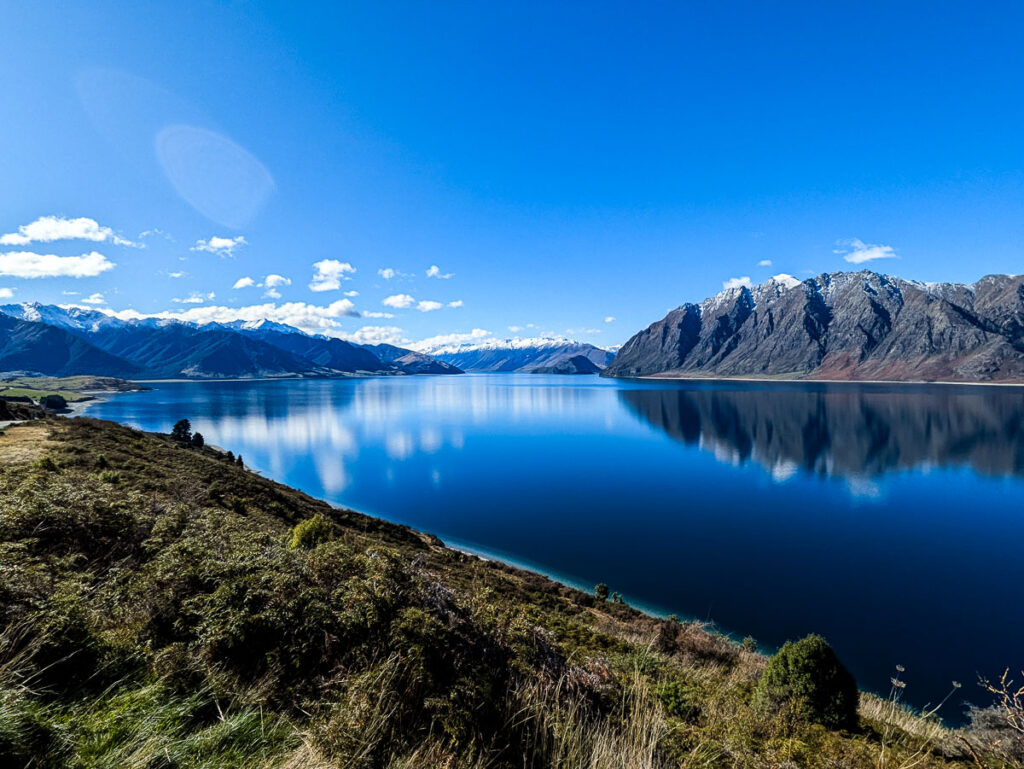 There are several viewpoints along Lake Hawea and Lake Wanaka, looking out over the respective lakes to the mountain ranges beyond.